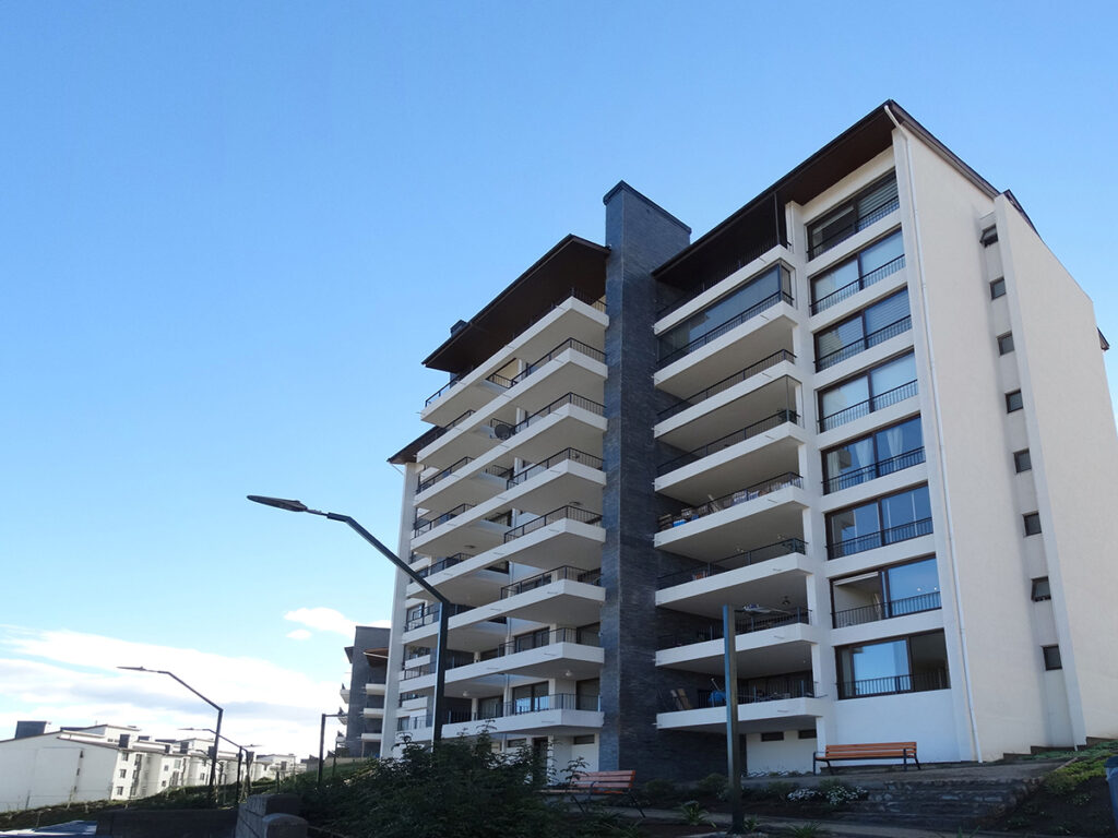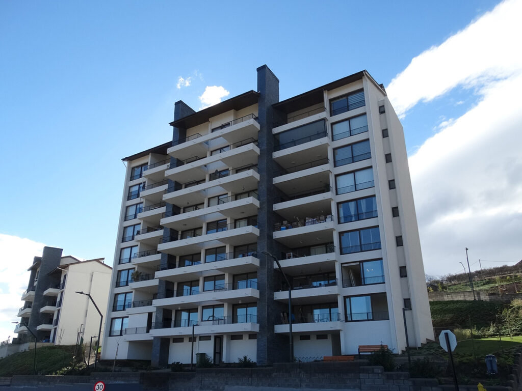 - Dado piso 8 (último): Estructuras de techumbre desde arriba abajo: teja asfáltica; barrera de humedad (membrana); placa terciada estructural de 20mm; estructura techumbre vulcometal; losa de hormigón de 14 cm, enlucido de yeso y pintura.