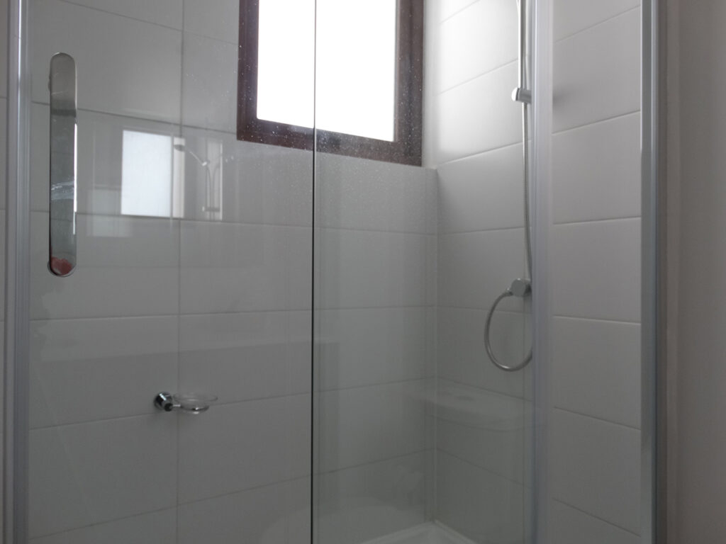 - Baño principal (suite) con cubierta de mármol blanco, shower door y piso gres porcelanato